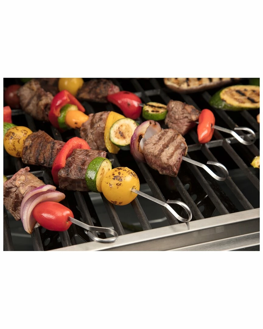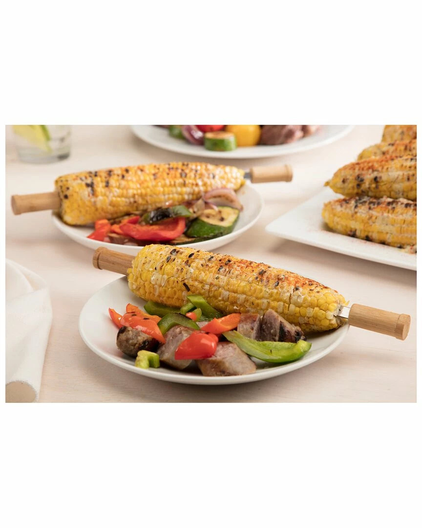 - Set Includes Spatula, Basting Brush, Cleaning Brush, Tongs, 4 Stainless Skewers and 4 Corn Cob Holders