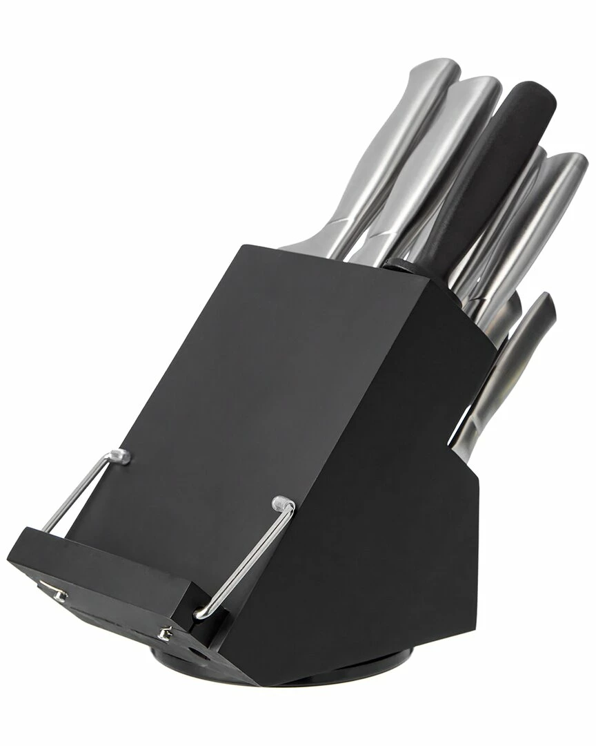 - Precision-tapered ground blades gradually narrow to an extremely sharp, fine edge Block rotates 360 degrees for easy access Ledged back with wires holds any cookbook or tablet Forged, durable, extra-wide safety bolster for perfect stability and control Lifetime Warranty