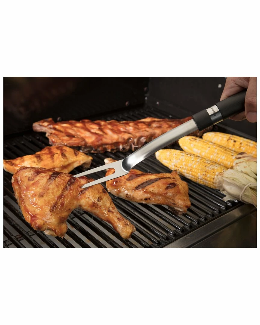 - Featuring grill length spatula, tongs and fork with steel tool edges and ergonomic handles