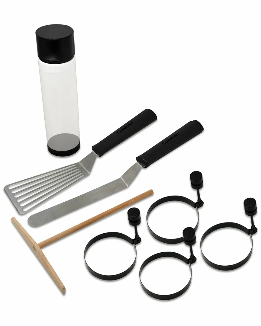 - Design details: Enjoy the ease of making breakfast on the griddle with the Cuisinart 8-Piece Griddle Breakfast and Crepe Set. This set comes with everything you need to make breakfast easy and fun. The Batter Bottle is easy to use and features measurements on the side of the cylinder. Whether you are making pancakes or crepes, the Batter Dispenser allows you to customize the amount of batter that is poured onto your hot surface. When making crepes, use the Crepe Spreader to evenly distribute the batter over the surface to make a thin, perfect crepe. Easily flip your crepe or pancakes with the thin sides of the Crepe Spatula. The set also includes 4 Egg Rings, great for perfectly shaped eggs and pancakes! The elongated spatula has beveled edges that slide underneath food making flipping pancakes and eggs easy. The 8-Piece Griddle Breakfast and Crepe Set is great for camping, tailgating and backyard fun!; Easy Clean 24 oz. Batter Dispenser easily and accurately dispense pancake, crepe, and most other batters and sauces; Set includes 4 egg ring for making perfect size eggs or pancakes; Elongated spatula makes cooking and serving your favorite foods easier; Crepe Spreader evenly distributes batter over surface for a thin, perfect crepe; Crepe Spatula features thin edges to get under and flip the delicate crepe