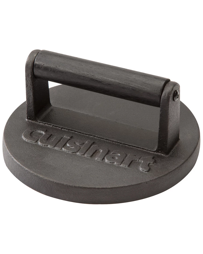 - Design details: Lock in the juicy flavors and create a caramelized crust with the Cuisinart Cast Iron Smashed Burger Press! Place a loosely shaped ball of meat on your oiled skillet or griddle (you can add a little butter for that extra flavor), then use the heavy Smashed Burger Press and press down until you touch the cooking surface. The edge-lip of the burger press keeps all the flavorful juices locked into place. The patty will have a nice caramelized layer on the bottom, make sure you scrape under the patty prior to flipping it, to make sure you keep that crust in tack! Classic smashed burgers are topped with Mayo and American cheese, but with this burger press you can make your own creations at home! Change up your normal burgers with the Cuisinart Cast Iron Smashed Burger Press, the thinner patty will add a flavorful crust that will amaze your family and friends; Heavy weight to help smash the patty down to a 6 flat patty shape. The 1cm raised edge locks in the juices and fats in while pressing down on the patty; Do it like the pros! Place a piece of parchment paper over the loosely packed ball of meat before smashing down! Provides an easy and clean transition between pressing each burger down; For the best tasting smashed burgers, experts say to buy 80% ground beef. That means there is 20% fat in the ground meat, which is extra flavor for the smashed burgers!; Crispy, cracked edges and a juicy center is what you can expect when you make smashed burgers with this cast iron burger press.