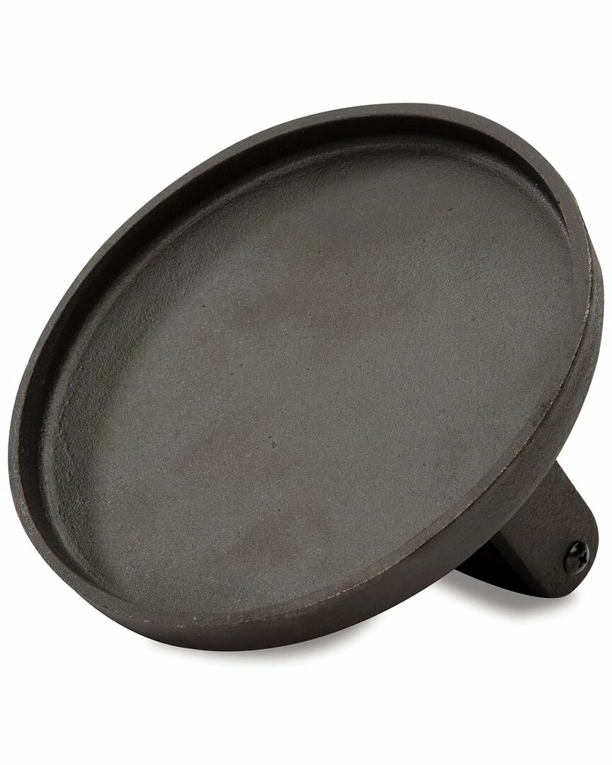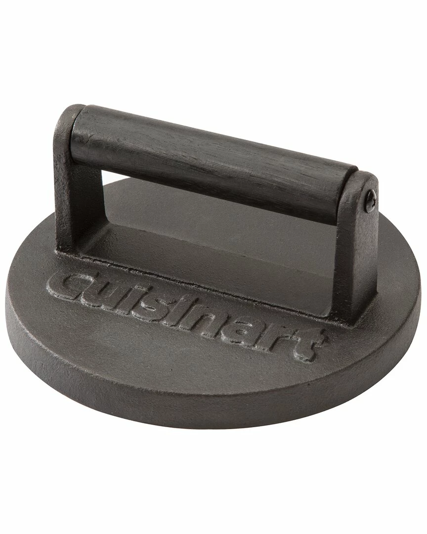 - Design details: Lock in the juicy flavors and create a caramelized crust with the Cuisinart Cast Iron Smashed Burger Press! Place a loosely shaped ball of meat on your oiled skillet or griddle (you can add a little butter for that extra flavor), then use the heavy Smashed Burger Press and press down until you touch the cooking surface. The edge-lip of the burger press keeps all the flavorful juices locked into place. The patty will have a nice caramelized layer on the bottom, make sure you scrape under the patty prior to flipping it, to make sure you keep that crust in tack! Classic smashed burgers are topped with Mayo and American cheese, but with this burger press you can make your own creations at home! Change up your normal burgers with the Cuisinart Cast Iron Smashed Burger Press, the thinner patty will add a flavorful crust that will amaze your family and friends; Heavy weight to help smash the patty down to a 6 flat patty shape. The 1cm raised edge locks in the juices and fats in while pressing down on the patty; Do it like the pros! Place a piece of parchment paper over the loosely packed ball of meat before smashing down! Provides an easy and clean transition between pressing each burger down; For the best tasting smashed burgers, experts say to buy 80% ground beef. That means there is 20% fat in the ground meat, which is extra flavor for the smashed burgers!; Crispy, cracked edges and a juicy center is what you can expect when you make smashed burgers with this cast iron burger press.