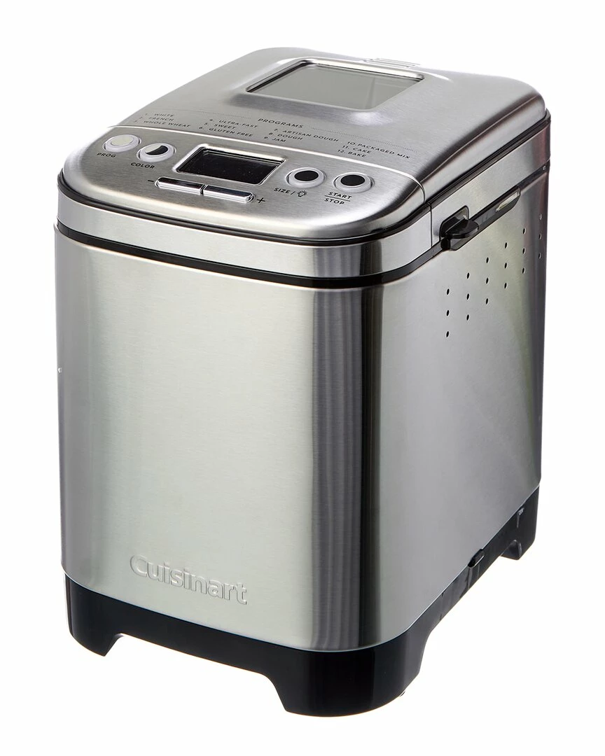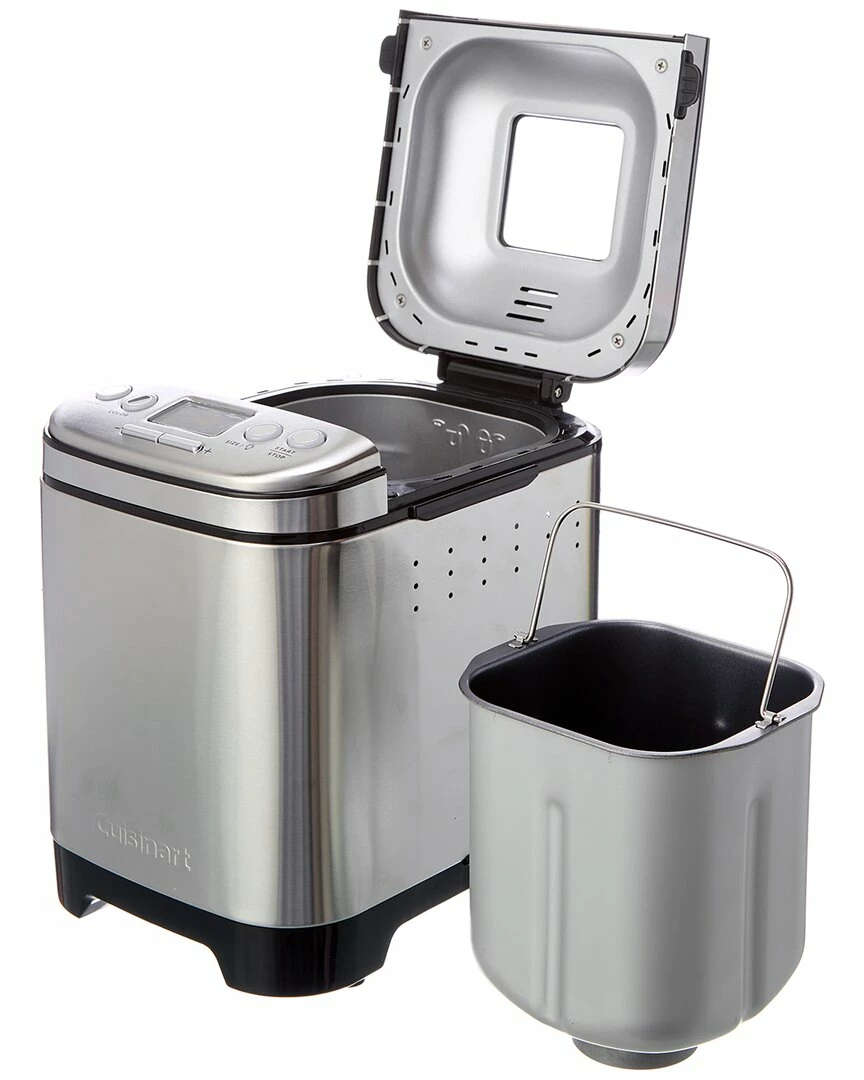 - 12 preprogrammed menu options fully automatic, easy to use 3 crust shades light, medium, or dark Bakes up to a 2-pound loaf Vertical baking pan for counter-friendly compact design Viewing window to monitor the process Removable kneading paddle and bread pan Interior light to check bread as it bakes Easy-to-read LED display Bake-Only option 13-hour delay start fresh bread, anytime! Power failure backup Compact vertical bread maker with stainless steel exterior BPA-free Cuisinart-quality technology promises superior crust, color and texture