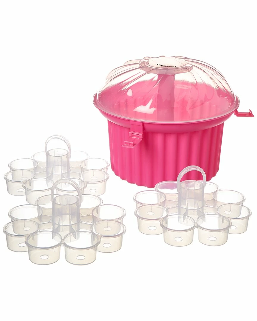 - Holds 24 cupcakes, stacked in three tiers of eight 3 removable inserts for easy loading and cleaning Handle for easy carrying Simple snap-close design