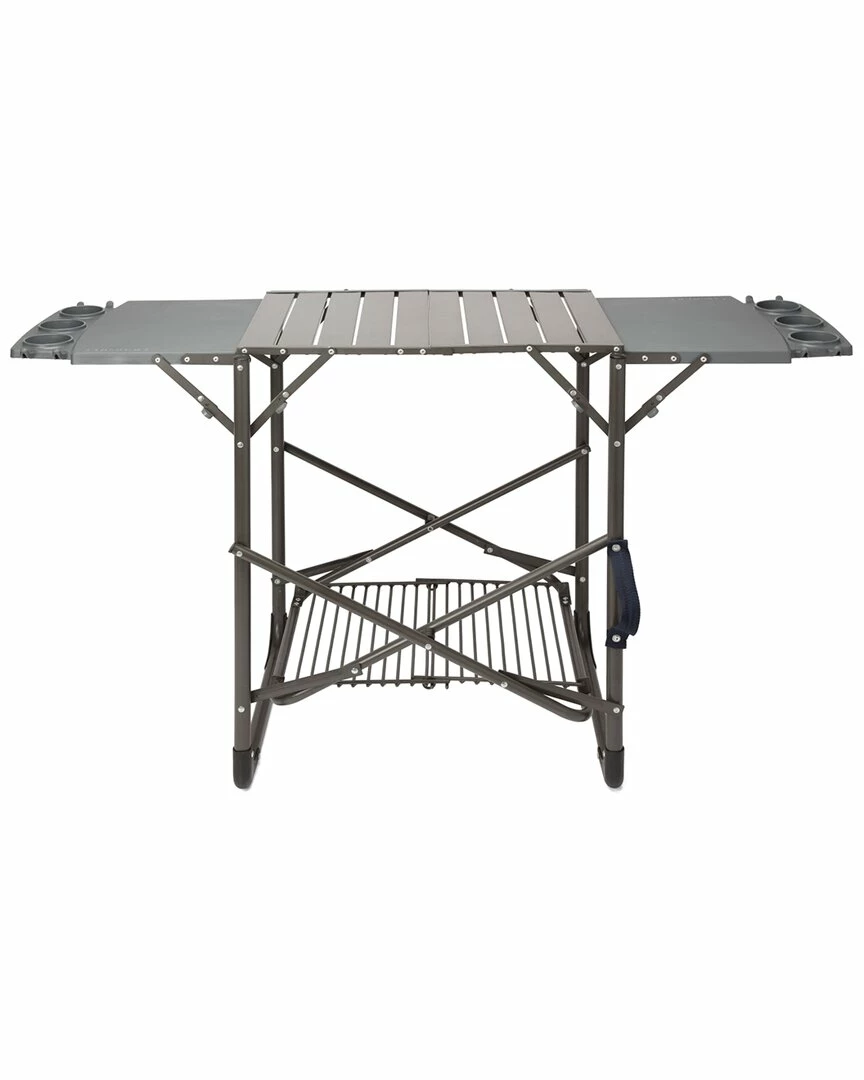 - Two flip up side tables! The side tables together have 6 cup holders and 8 tool hooks. Perfect for entertaining!