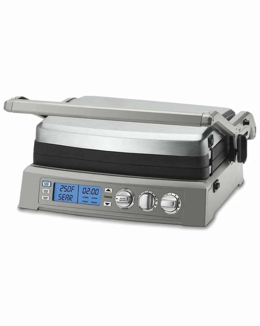 - The Griddler Elite boasts six impressive cooking functions in sleek brushed stainless steel that gleams on any kitchen countertop. This stylish electric grill can tackle any task, with the ability to grill, griddle, half grill, half griddle, panini press, and top melt sandwiches, meats, and appetizers. The electronic display lets you set a timer and dual zone temperature control, meaning you can griddle an egg on one plate while grilling bacon on the other across a generous 240 square inches of cooking surface. With reversible plates, our superior SearBlast feature locking flavor into steaks at 500?F, and a top cover that is fully adjustable, cooking is perfectly customized and precise every time. The dishwasher safe nonstick grill plates are also conveniently removable for easy clean up after even the gooiest, cheesiest sandwich or sticky barbecue sauce.