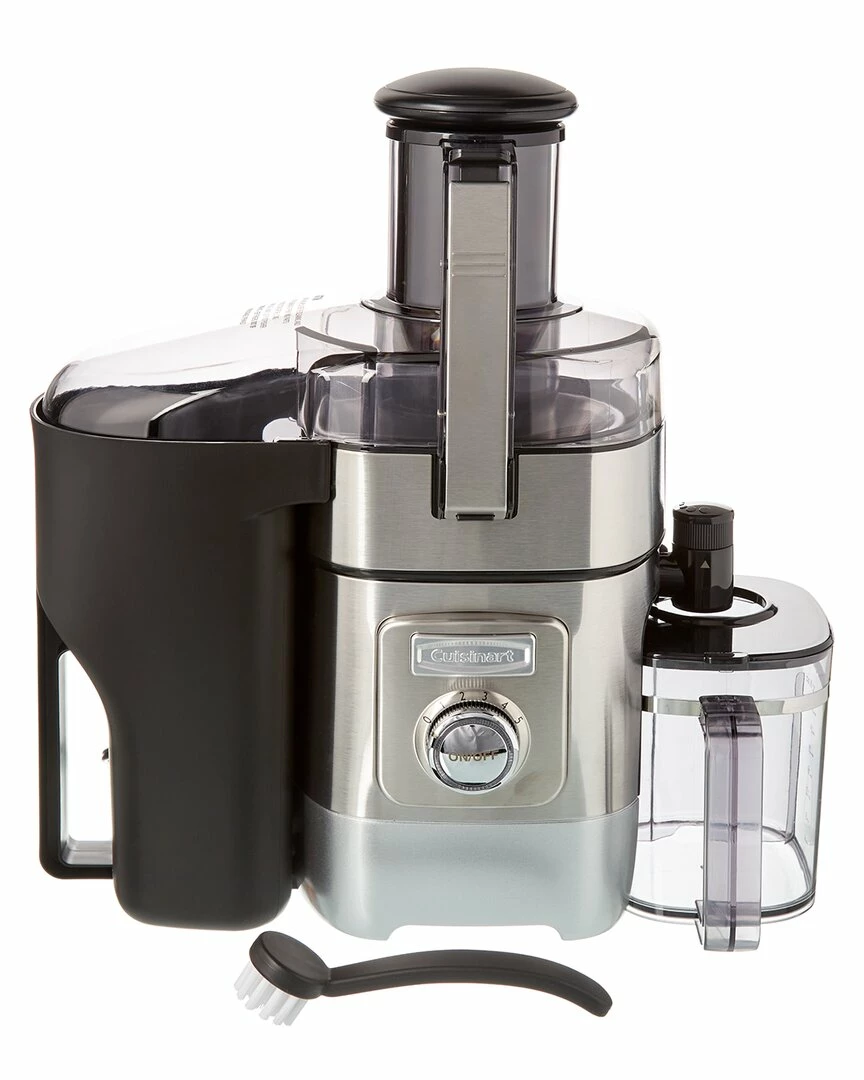 - Its never been easier to juice at home with the die-cast and stainless steel Cuisinart Juice Extractor. The 3in feed tube easily handles your favorite whole fruits and vegetables and the adjustable flow spout eliminates drips and spills for clean countertops. The 5-speed control dial is easy to operate, letting you juice the softest berries, leafiest kale, or crunchiest apple into the 1-liter pitcher. The unique filter basket reduces foam, and the unit is so quiet, you wont wake the family while youre making fresh, nutritious juice for breakfast!