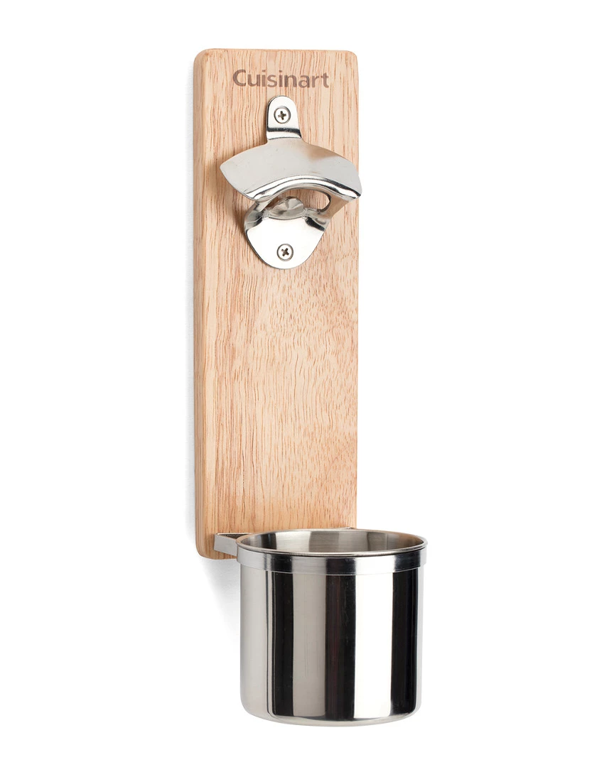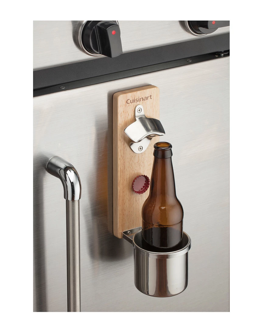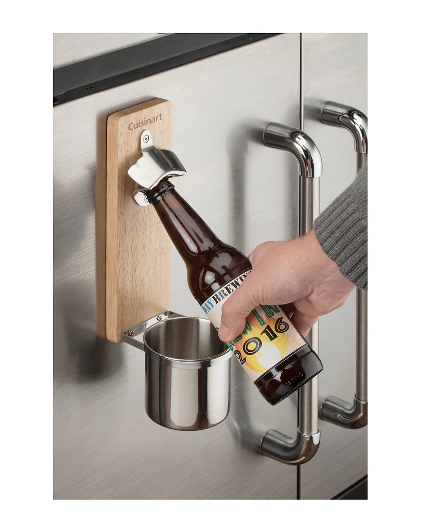 - Thirsty? Looking for a bottle opener? Have no good place to put your drink? Each of those questions are answered with the Cuisinart Magnetic Bottle Opener & Cup Holder. Simply place the cup holder on any magnetic surface and your cup holder is secure. If you have a bottle that needs a bottle opener, use the built-in bottle opener and let the magnet catch the cap. And don’t limit yourself to bottles! This cup holder can hold cans, bottles, cups, and just about anything else you’re drinking.