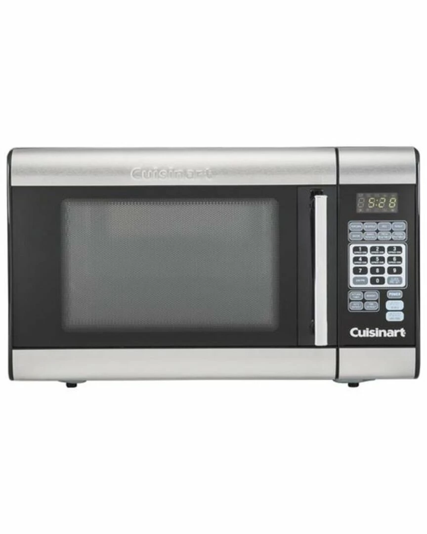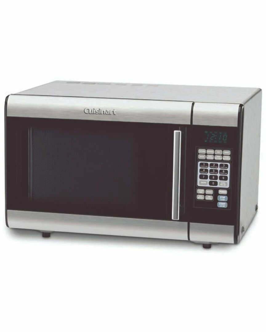 - 1.0-cubic-foot 1000 watts Stainless steel control panel and door with embossed Cuisinart logo and dark tinted glass window Stylish chrome handle Stainless steel interior absorbs no odors and is easy to sanitize Rotating 12″ glass tray Touchpad controls with LCD Two convenient defrost functions to defrost food by weight or time Eight preset options with serving-size options for each (total 25): Popcorn, Beverage, Rice, Reheat, Fresh Vegetables, Frozen Vegetables, Baked Potatoes, and Bacon Two-stage cooking operation: Allows microwave to be set so that first stage of operation (such as 15 minutes on defrost), is automatically followed by a second stage (such as cooking for 8 minutes) Instruction and recipe book included Limited 3-year warranty BPA Free