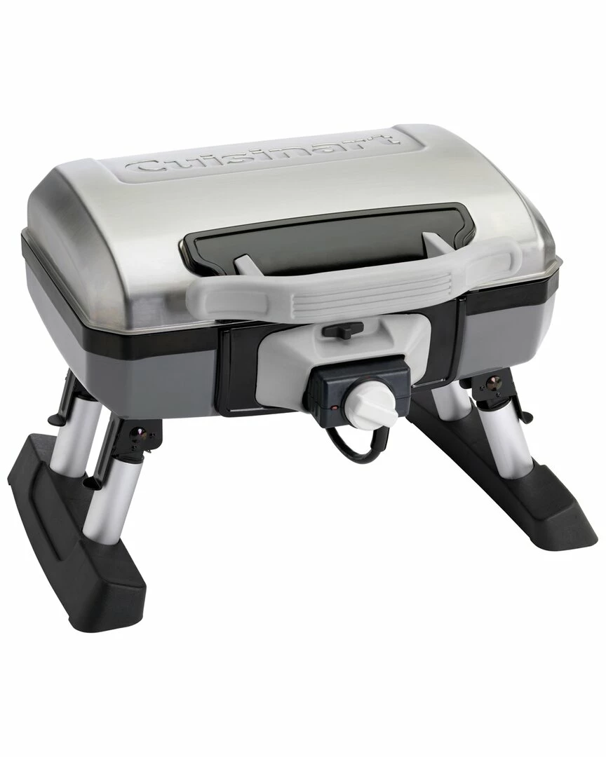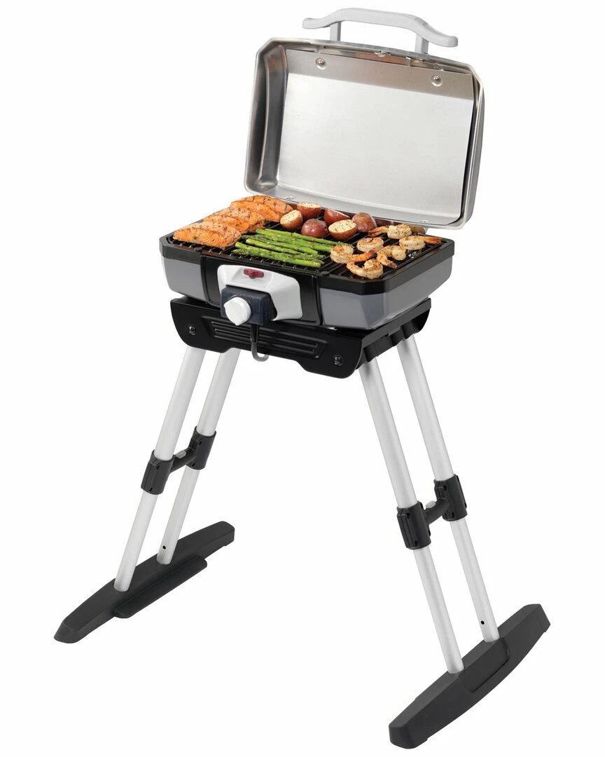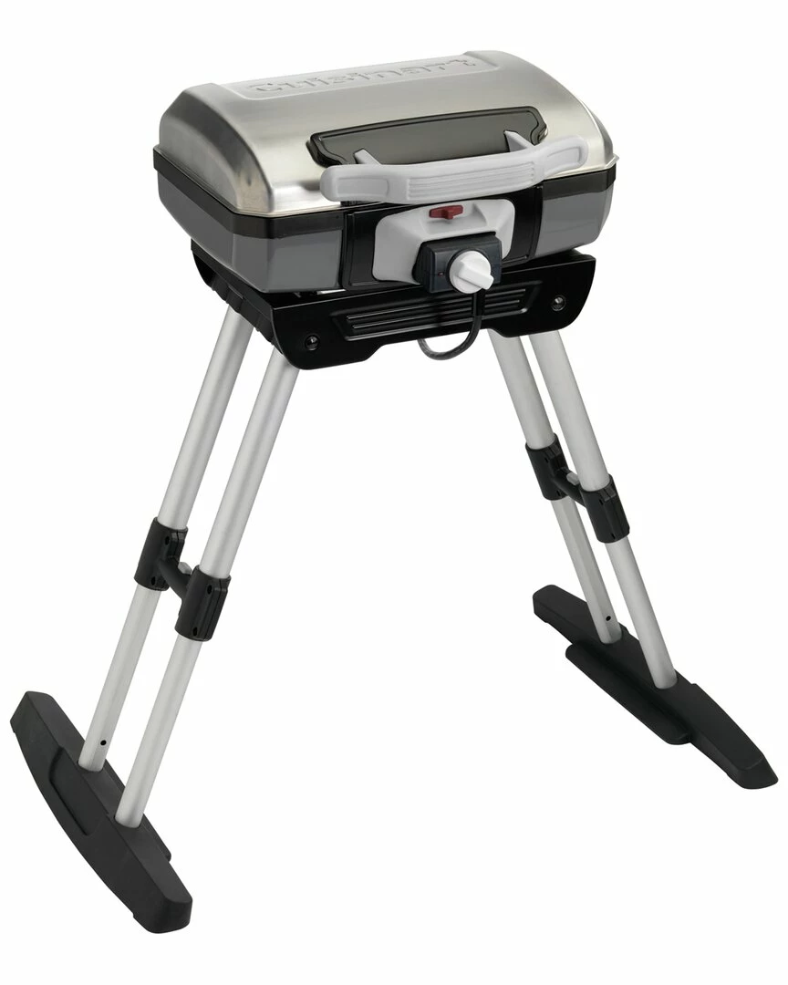 - Cuisinart’s Outdoor Electric Grill with VersaStand integrated adjustable telescoping base provides authentic grilling performance and flavor. It’s small format fits easily on balconies and small patios – great for places that propane or charcoal grills aren’t allowed. And although the grill is compact its ample cooking grate is large enough to cook most family meals – 8 steaks 8 hamburgers 6 – 10 chicken breasts or over 4 lbs. of fish! The grill heats up very quickly and reaches temperatures high enough to sear a steak to perfection. Storage is quick and easy as well with the novel telescoping base that quickly transforms from storage to tabletop to floor standing use. It folds up in seconds and is integrated into the grill for added convenience. The grill plugs into a standard household electrical receptacle and is UL approved for outdoor use.