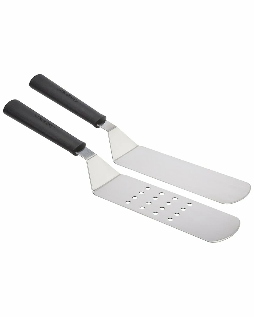 - Design details: The Cuisinart 2 Pack Griddle Spatulas is the perfect set for all your griddle needs. Both spatulas feature rounded ends to prevent scratching on griddle surface. Fats and liquids drain easily through the perforations featured on one of the spatulas. This set is great for Teppanyaki, Hibachi, camping, tailgating, and more!; Two sturdy outdoor grills and griddle spatulas; Perfect for Teppanyaki, Hibachi, camping, tailgating, and more!; Rounded end to prevent scratching on griddle surface