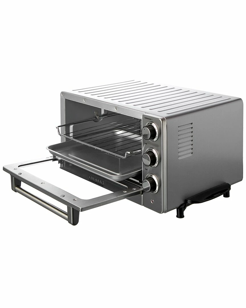 - 1800 watts of power 0.6-cubic-foot capacity fits a 12″ pizza and 6 slices of toast Functions: bake, broil, toast, convection bake, convection broil and warm Precise toast shade control Nonstick interior for easy cleaning Brushed stainless steel finish Power On LED indicator Slide-out crumb tray Limited 3-year warranty