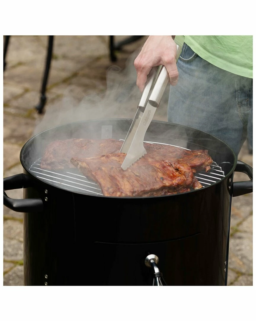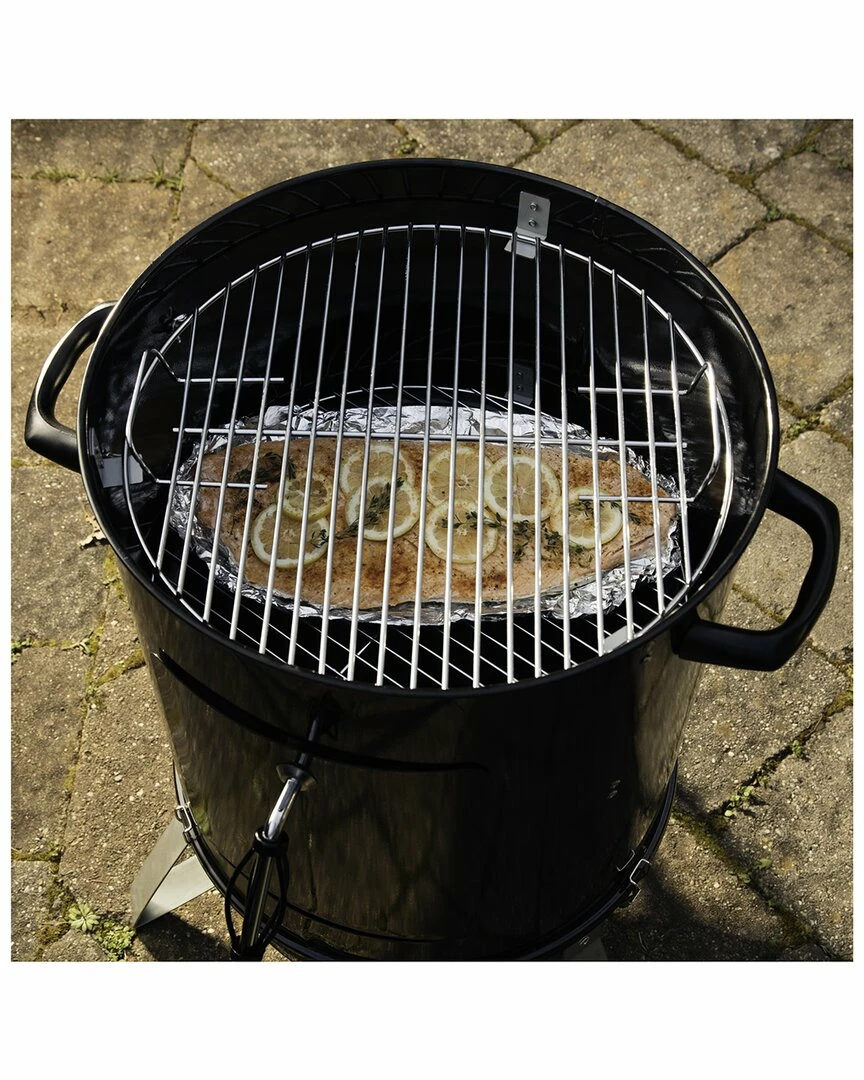 - Design details: porcelain enamel water bowl; two 18in solid steel cooking grates; vertical barrel design; vertically hinged door