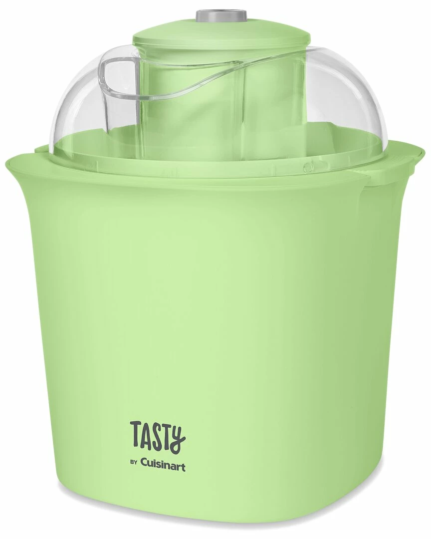 - Ice cream is an All American favorite and now you can make any flavor you can dream up – a quart and a half at a time! This ice cream maker is fully automatic; all you have to do is add your ingredients. Think out of the carton! That big fill spout begs for handfuls of crushed cookies or peppermint sticks, nuts, chocolate chips …whatever your taste buds desire. Imagination on vacation? Open up the Tasty™ recipe booklet; it’s loaded with good ideas. And if ice cream suddenly sounds too rich, go for the frozen yogurts!Features & BenefitsIce Cream & Frozen Yogurt1.5 Quart CapacityFully Automatic OperationLarge Ingredient Fill SpoutBPA FreeEasy-Clean HousingIncludes automatic mixing paddleLimited 18-month warranty